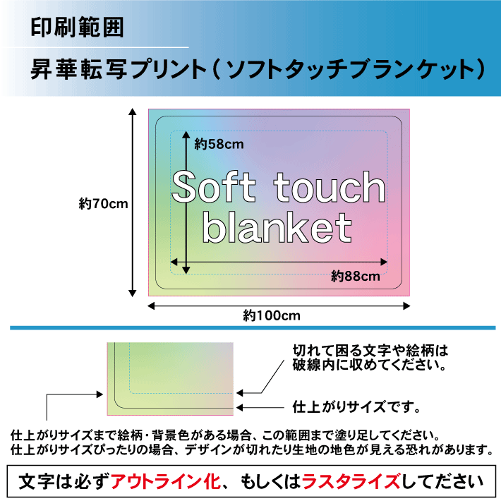 ふわふわでソフトな質感のブランケットにフルカラープリントが映えて大満足です。ポリエステル100%の高品質な毛布生地に、イラストやデザインデータをそのままきれいに転写プリントできました。