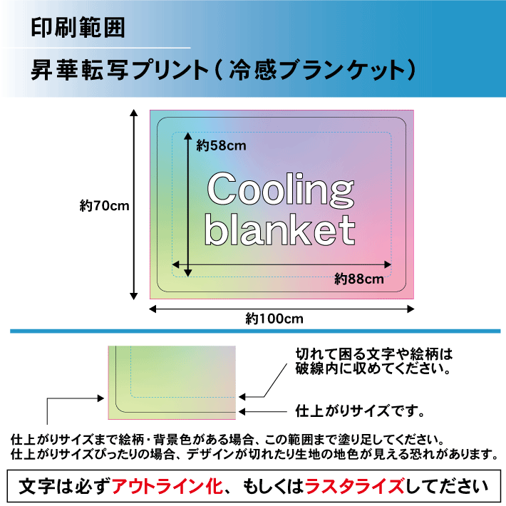 | 印刷柄推奨範囲 | 58×88㎝以内 ※大事な文字、デザインは推奨範囲内に納めてください ※表面のみプリント可、両面プリント不可 |